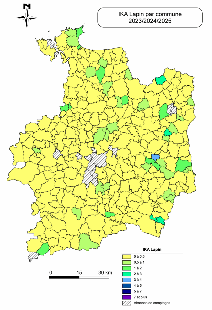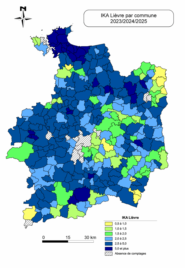 L’Indice Kilométrique d’Abondance (IKA) est un indicateur utilisé pour estimer la présence des espèces animales sur un territoire. Il correspond au nombre moyen d’animaux observés par kilomètre parcouru lors de comptages réalisé par le service technique en partenariat avec les chasseurs locaux suivant un protocole élaboré par l’Office Français de la Biodiversité (OFB).