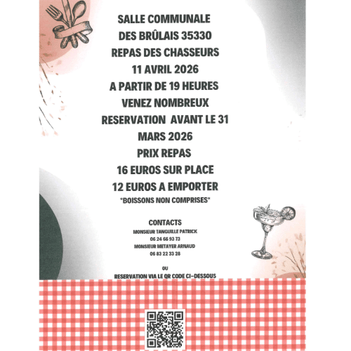 Repas associatif de l’ACCA des Brûlais 🍽️ L’ACCA des Brûlais a le plaisir de vous inviter à son repas associatif, le samedi 11 avril à partir de 19h, à la salle communale de Les Brûlais. Le gibier sera à l’honneur avec terrine et ballotine de gibier, préparées avec soin. 16€ sur place (boissons non comprises) […]