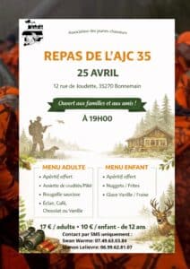 L’Association des Jeunes Chasseurs d’Ille-et-Vilaine a le plaisir de vous inviter à son repas associatif, le vendredi 25 avril à partir de 19h, au 12 rue de Joudette, 35270 Bonnemain.