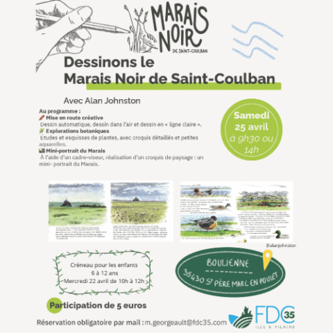 Participez à un atelier créatif avec Alan Johnson et explorez le Marais Noir de Saint-Coulban à travers le dessin naturaliste. Initiez-vous au dessin automatique, au croquis de plantes et à la réalisation de mini-portraits du paysage. Deux créneaux disponibles (9h30 ou 14h), durée 2h30. Participation : 5 €. Réservation obligatoire : m.georgeault@fdc35.com